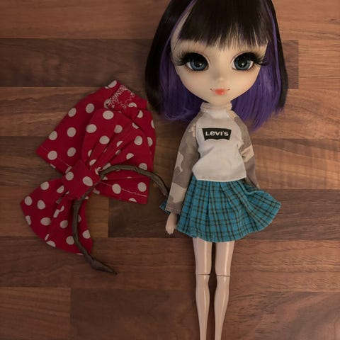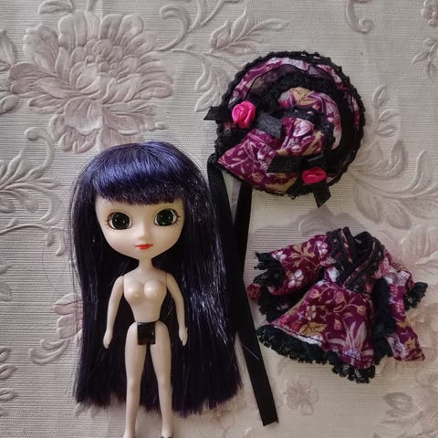Suloinen pikku-pullip omalla stock-asullaan ja -peruukillaan.