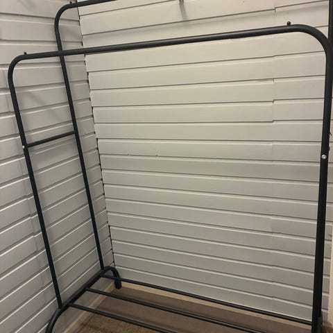Kuvan pienempi vaateteline, kevyt musta Sotkasta hankittu teline. Korkeus n.120cm. Ollut välillä ulkona, hieman ruostetta ruuvien kohdalla.