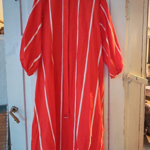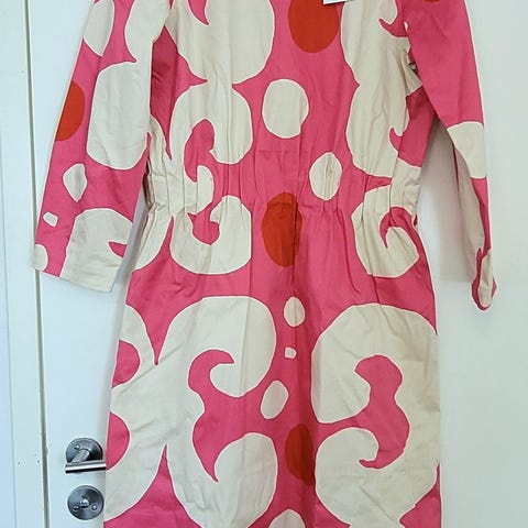 Kuvan mekko, musta pohjaväri, valkoiset hepat, pinkkiä mustassa pohjassa. Kainalo 50 cm, pituus 89 cm. Puuvillaa, koko vuori puoliksi viskoosia ja puoliksi polyesteriä.