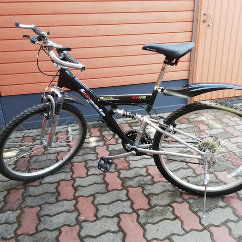 Gary Fisher cake 3 genesis täysjousitettu maastopyörä. 26” renkaat. Laitettu vaijeritoimiset levyjarrut pyörään.
