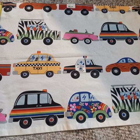 Design by Eero Aarnio. Kilpa-auto aiheiset verhot. Ylä- ja alareunassa kapea käänne, ommeltu siististi itse. Kangas on melko ohutta ja hyvin laskeutuvaa. Kankaan pohjaväri on vaaleahko sininen.