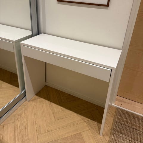 Pöydässä on kaksi vetolaatikkoa, jotka tarjoavat säilytystilaa esimerkiksi meikeille, hiustarvikkeille, kynille tai muille pienille tavaroille. Pöytälevy on helppo pyyhkiä puhtaaksi ja siinä on vain vähäisiä käytön jälkiä. Jalat ovat tukevat ja pöytä on muutenkin vakaa käytössä.