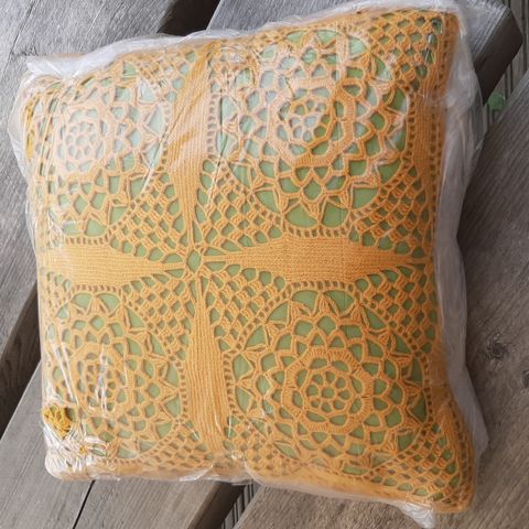 Kaksi kpl käsinvirkattuja keltaisia koristetyynyjä 30 x 32 cm, kalastajalankaa. Hinta 40 e/ kpl. Ei koskaan käytetty.