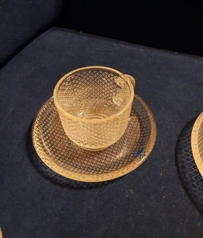 Nuutajärven Lasin Pauliina-sarjan kuumajuomakuppeja. Kahdeksan kuppia ja seitsemän aluslautasta. Vain nouto.
