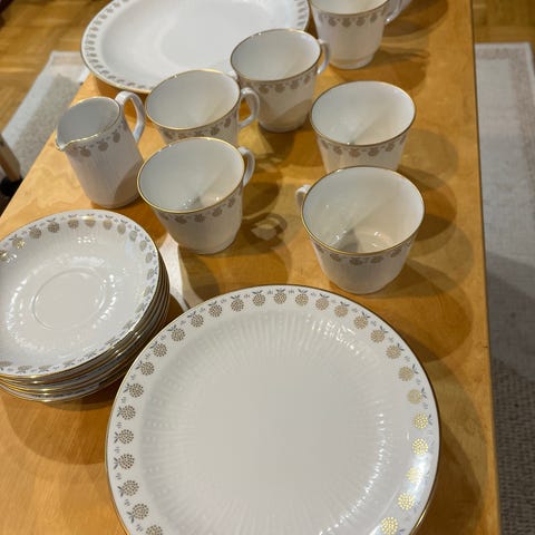 Hyvä kuntoisia 1950-luvun kahvi-/teekuppisettejä. Yhteen settiin kuuluu kahvikuppi ja aluslautanen. Suunnittelija on ollut Hertha Bengtson. Näitä on saatavilla useampia settejä. Nämä ovat ehjät ja hyväkuntoiset, ei ole käytön jälkiä. Kupin korkeus on noin 9 cm ja suuaukon halkaisija on noin 9 cm.