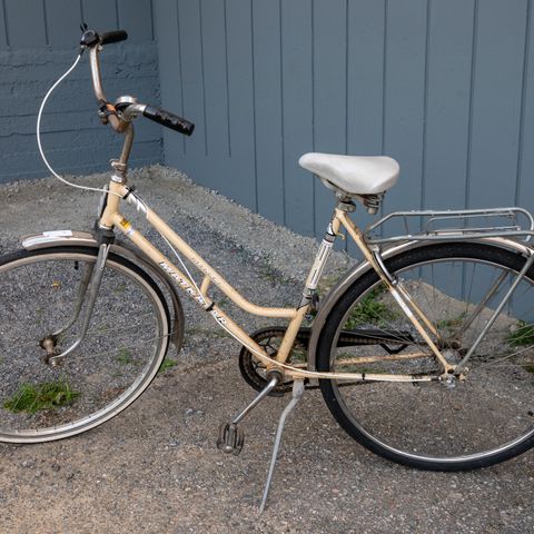 Kuvanmukainen elämää ja reissuja nähnyt Matkatar. Ruostetta löytyy jo ja vaihteet ei toimi mutta muuten hyvä pyörä ja miellyttävä ajella. Plussaa väristä! Hamaxin lastenistuin tulee kaupan päälle.