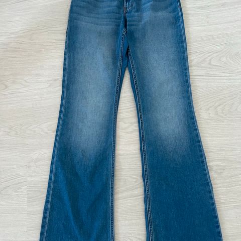 Lindexin Karen farkut, matala vyötärö, levenevät lahkeet. Pituus lyhennetty sopivaksi 160 cm naiselle. Tosi pehmeä kangas ja ohutta. Puuvilla, polyesteri, elastaani. Kunto hyvä. Mukavat jalassa.