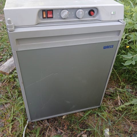 pakastelokeron sarana myös rikki. tämä on tehty ennen kuin dometic osti waecon, muuten samat mitat kuin uudemmassa. ovessa alkujaan ollut puupaneeli, mukaan se varmaan löytyy. muovit paikoittain kellastuneet ja säröillä.