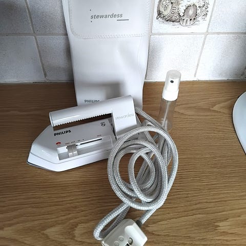 Uudenveroinen Philips-matkasilitysrauta. Yhdellä kaukomatkalla varalla ollut. Kauppaan kuuluvat suihkepullo ja säilytyspussi.