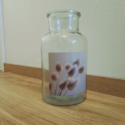 Koristepullo, 30cm korkea. Pullo on suorakaiteen muotoinen, ja siinä on koristeellinen, kuvioitu pinta, joka muistuttaa ristikkoa, " hevosen pää" Materiaali on lasia, ja sen violetti sävy antaa sille ainutlaatuisen ulkonäön.
