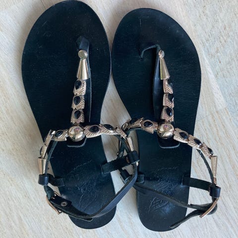Intialaiset mustat nahkaiset varvassandaalit. Koko 37. Hyvin siistit ja hyväkuntoiset. Kulumaa näkyy vain alapohjassa.