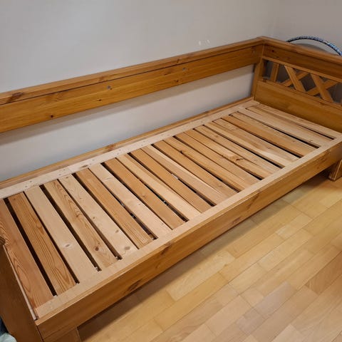 Annetaan tukeva ja siistissä ja kunnossa oleva laveri. Yksittäisiä kulumakohtia. Patjan leveys 75cm ostettu uutena ja juurikaan ei käytetty. Toimii hyvin esim vieraspetinä. Itse ommeltu keinonahkäpäällys, patja helppo ottaa tästä pois. Ei eläimiä taloudessa.