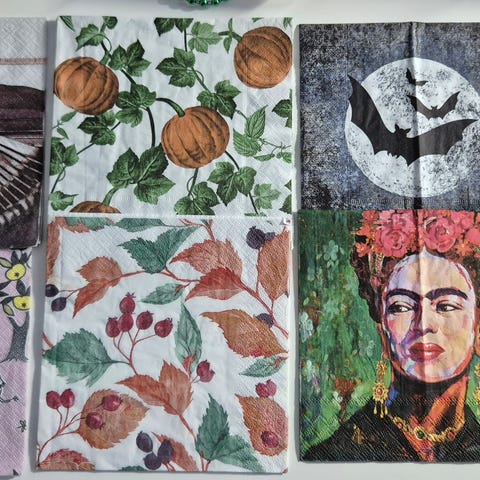 Enkelit servettisarja sisältää useita eri kuvioita ja värejä. Materiaali on paperia. Askarteluun.