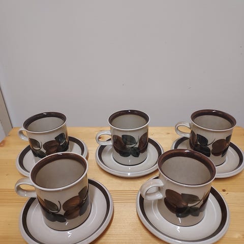 Arabian Ruija kahvikuppeja+tasseja+kakkulautasia saatavilla kaikkia kuusi kpl.