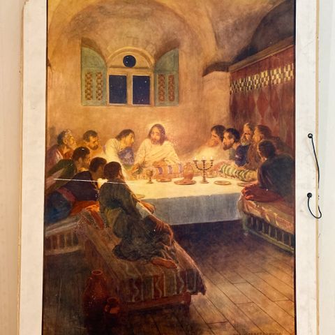 Koulutaulu aiheena ”Jeesus antaa anteeksi Pietarille”. Siisti, hyvä kuntoinen ja suora koulutaulu. Kulmissa pientä kulumaa. Koko: 48,5 x 68 cm.