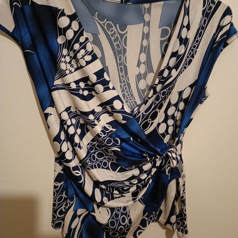 Turkoosi / sininen. Miellyttävästi laskeutuva materiaali. Sopii hyvin myös äitiysvaatteeksi väljän mallinsa ansiosta.