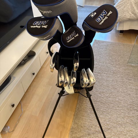 Myydään kohtalaisen kuntoiset Ben Sayersin golfmailat. Settiin kuuluu S, P, 9,8,7,6,5,4 ja 3 mailat sekä Puu 3 ja putteri, jotka ovat samaa sarjaa. Lisäksi Joxx P, Dynatpur PW ja uudempi Ben Sayersin putteri. Mukana myös lattana Dunlopin puu 5, 19 asteinen maila. Mukana myös Sayersin kuvassa näkyvä bagi, jossa isosta taskusta vetskari rikki. Käypä setti kaikenlaiseen hauskanpitoon!!