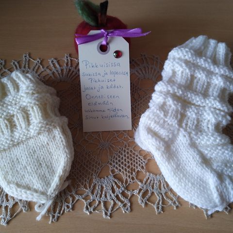 Käsintehty vauvan Kettu aihe junasukat ja lapaset Nalle langasta.