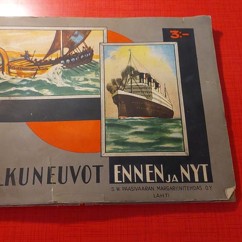 Vanha keräilykansio "Kulkuneuvot ennen ja nyt" S. W. Paasivaaran margariinitehdas Oy Lahti.
