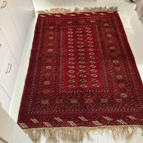 100% villamatto, loimi puuvillaa, luonnossa värit hitusen tummemmat kuin kuvassa, ehjä, tahraton ja hajuton. Hapsut vähän lyhentyneet, sivureunat siistit, paksunukkainen, ei kuluneita kohtia, yleisilme siisti. Yhden hengen tupakoimaton ja eläimetön talous.