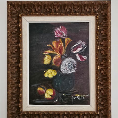 Jarkko Peltonen "Duo" öljyväri levylle mitat kehysten päältä korkeus n.46cm leveys n.33,5cm kuva-ala korkeus n.29cm leveys n.16cm