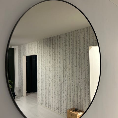 Myydään upea pyöreä peili. Halkaisija noin 109 cm. Takana yhdessä kohdassa kulumajälki, josta on kuva. Muutoin peili on täysin ehjä ja hyvässä kunnossa. Tukevat ripustuskoukut takana. Ainoastaan nouto.