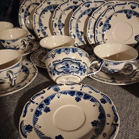 4 kahvikuppia ja leipälautasta , kahvikannu, jonka kannessa kolhu