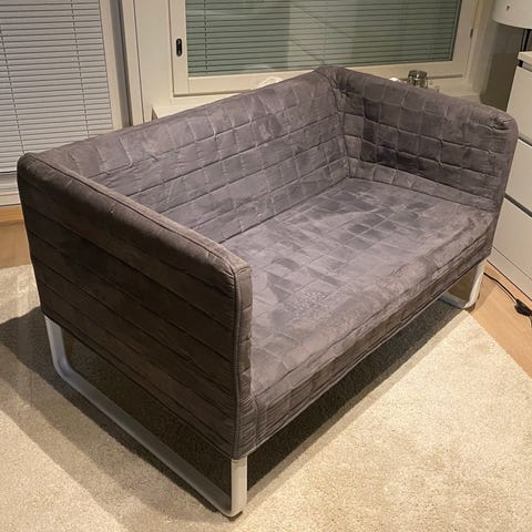 Pieni sohva. Kevyt sohva, siisti ehjä verhoilu, pikku vikoja. (Näkyy sohva tyynyn takana selkänojassa, viimeinen kuva). Kaikki viat huomioitu hinnassa. Nopea nouto pihlajamäestä.