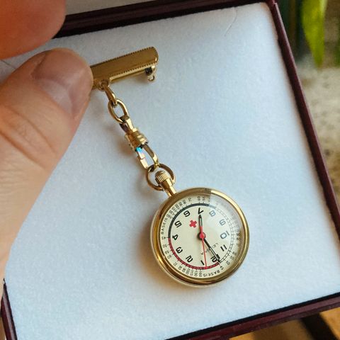 Koristeellinen ja kätevä vaatteeseen kiinnitettävä kevyt kello, joka ei häiritse esim. hoitotyötä.