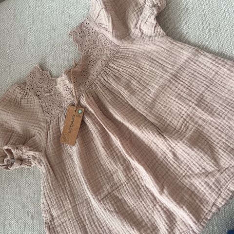 Newbie paita tytöille, koko 116. Väri on beige. Mekko on valmistettu pehmeästä musliinipuuvillasta ja siinä on kauniit pitsiyksityiskohdat yläosassa. Sopii erinomaisesti erilaisiin tilaisuuksiin ja arkikäyttöön.