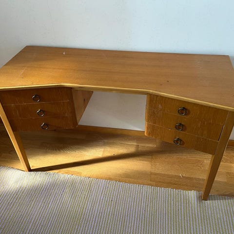 Siro kampauspöytä. Pinta kulunut, kaksi vedintä rikki. Laatikot hankaavat vastaan vetäessä, kiskot uusimalla saisi hyvän. Vaatii pesua.
