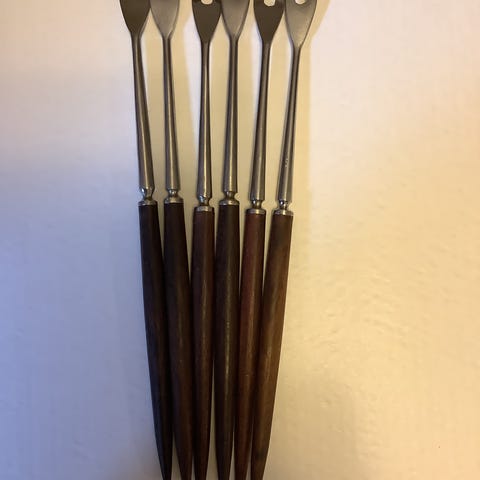 Huom! Minulla on myynnissä myös teak-vartiset fonduehaarukat, 6 kpl, Painometalli Oy (katso viimeinen kuva).
