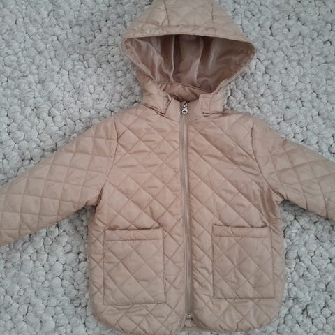Hyväkuntoinen pitkämallinen kevyt-toppatakki kokoa 120. Irroitettava huppu.