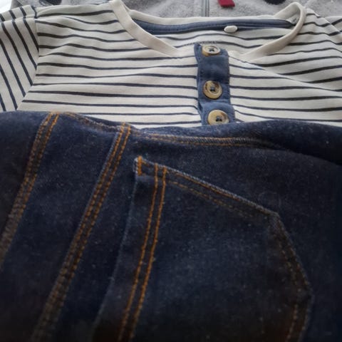 Myynnissä kaksi pitkähihaista trikoopaita kokoa 98-104, kunto jo käytetty, valkoinen ei enää kirkas ja pieniä maalitahroja löytyy, tummansinisesta korjattu pari pientä reikää kynnärpään kohdalla. Yhteensä 2e.