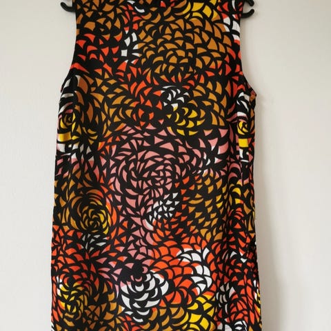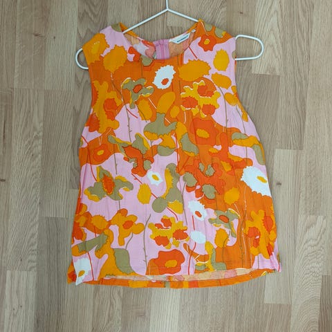 Ritva Fallan Marimekolle suunnittelema toppi. Koko on 38, mitat kainalon kohta 46 cm ja topin pituus 52 cm. Väritys punainen, kulta ja hopea, vuori punainen, sivulla vetoketju. Toppia ei ole käytetty, ainoastaan sovitettu. Kangas polyesteri-, viskoosi- ja polyamidisekoitetta, vuori viskoosia. Kuivapesu.