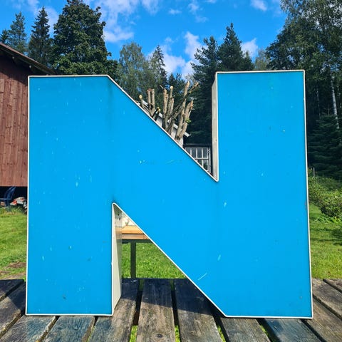 Turkoosi valokirjain iso I. Kuori metallia. Alkuperä Siemens. Sähkömiehen ledittämä. Sisustusliikkeen jäämistöä. Vasemmalla jonkin verran naarmua. Leditys tai muuntaja on ilmeisesti irronnut jostain kohtaa, kun valot päällä näkyy johtoa. Heti kun kerkeän avaan ja korjaan sen.