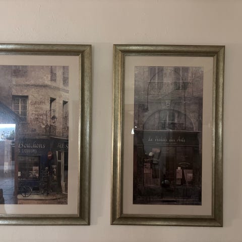 Lasista ja tinasta valmistetut taulut 2 kpl. Leveys 9 cm ja korkeus 11,5 cm