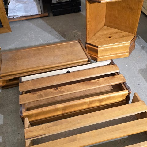 Materiaalina massiivikoivu, koivuviilutettu MDF-levy ja koivuvaneri. Puuosien väri kirsikka.