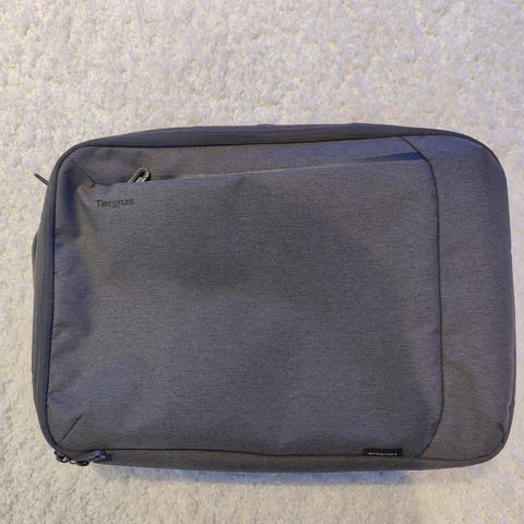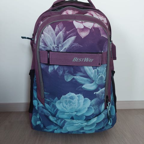 Muutaman kerran selässä ollut rullattava reppu, 30l. Pitää hyvin vettä, kätevä esim. pyöräilyssä.
