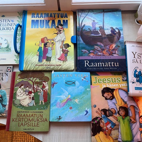 Myydään setti uudenveroisia lasten kristillisiä kirjoja, joiden avulla voi tutustua Raamatun kertomuksiin. Yhdessä kirjassa palapelejä sekä äänitoiminto, joka ei enää toimi. Mukana myös käyttämätön puuhakirja.