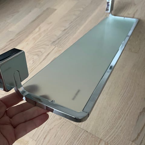 - Lasinen seinähylly 60cm, jossa kromi-messinkiset kiinnikkeet ja tummaa puuta.