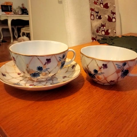 Lomonosov LFZ teekupit ja tassit " Kultainen lotus" 8 paria, hyväkuntoiset, kahden kupin pohjassa valmustusvirhet.