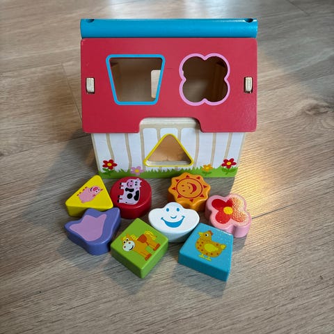 Puinen talo eri muotoisilla reiillä, joihin laitetaan puisia kuvioita