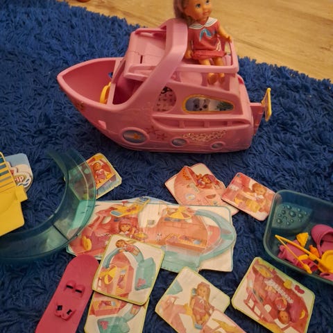 Viisi erilaista muovista lelulaivaa: kolme pienempää ja kaksi isoa. Leikin jälkiä vaihtelevasti, kelta-sinisessä eniten.