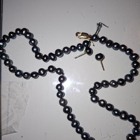 Kuvanmukaiset helmikorut, kaulakoru ja korvakorut, avaamattomassa pakkauksessa.
