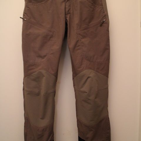 Hyvin vähän käytetyt Haglöfsin kevyet ulkoiluhousut. Lahkeissa kuminauhakiristys. Materiaalilappu leikattu pois.
