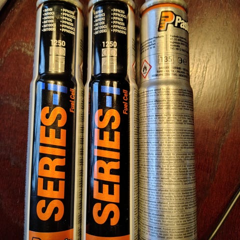 Paslode i-sarjan kaasupatruunat 2kpl, toisessa suojamuovi liitäntäosasta pois, mutta kaasua on joko täysi pullo tai hitusen vajaa. Toinen pullo suojamuovilla ja käyttämätön.