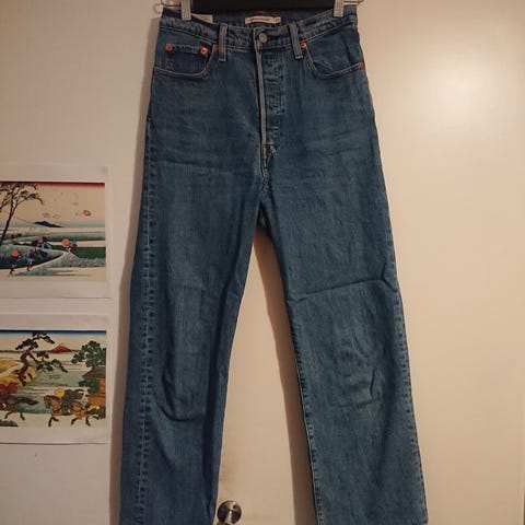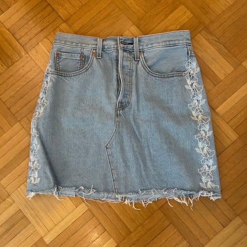 Kerran käytetty Levi's farkkuhame. Moitteeton kunto. Kokolapussa XS, mutta menee myös S-koolle. Vyötärön leveys 37 cm, pituus 61,5 cm. Materiaali joustaa hiukan. Väri on tummansininen.