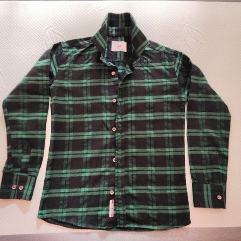 Hyväkuntoinen poikien flanellipaita, koko 146/152 cm (10-12 v). Värit: musta ja 3 harmaan eri sävyä.