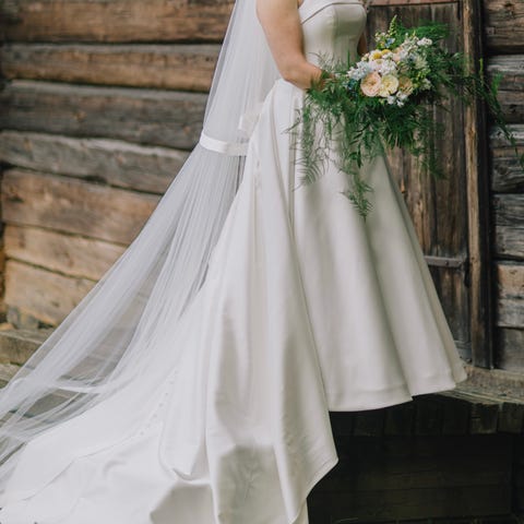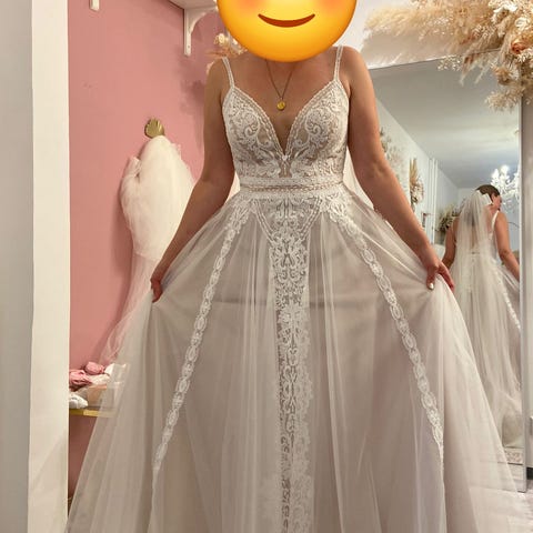 Hintaan sisältyy pitkät pitsihihat ja pukupussi. Pesty käytön jälkeen.